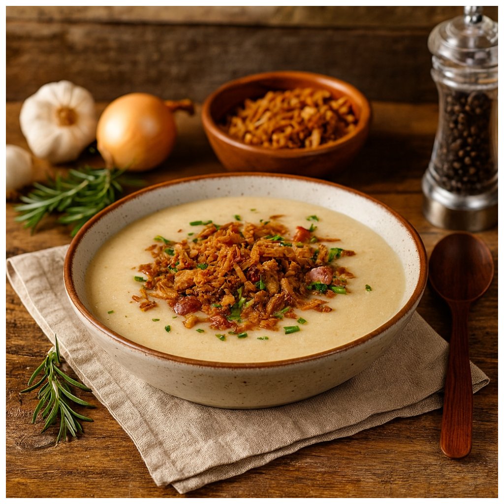 🥣 Recept – Krémová zemiaková polievka s „zlatým“ toppingom