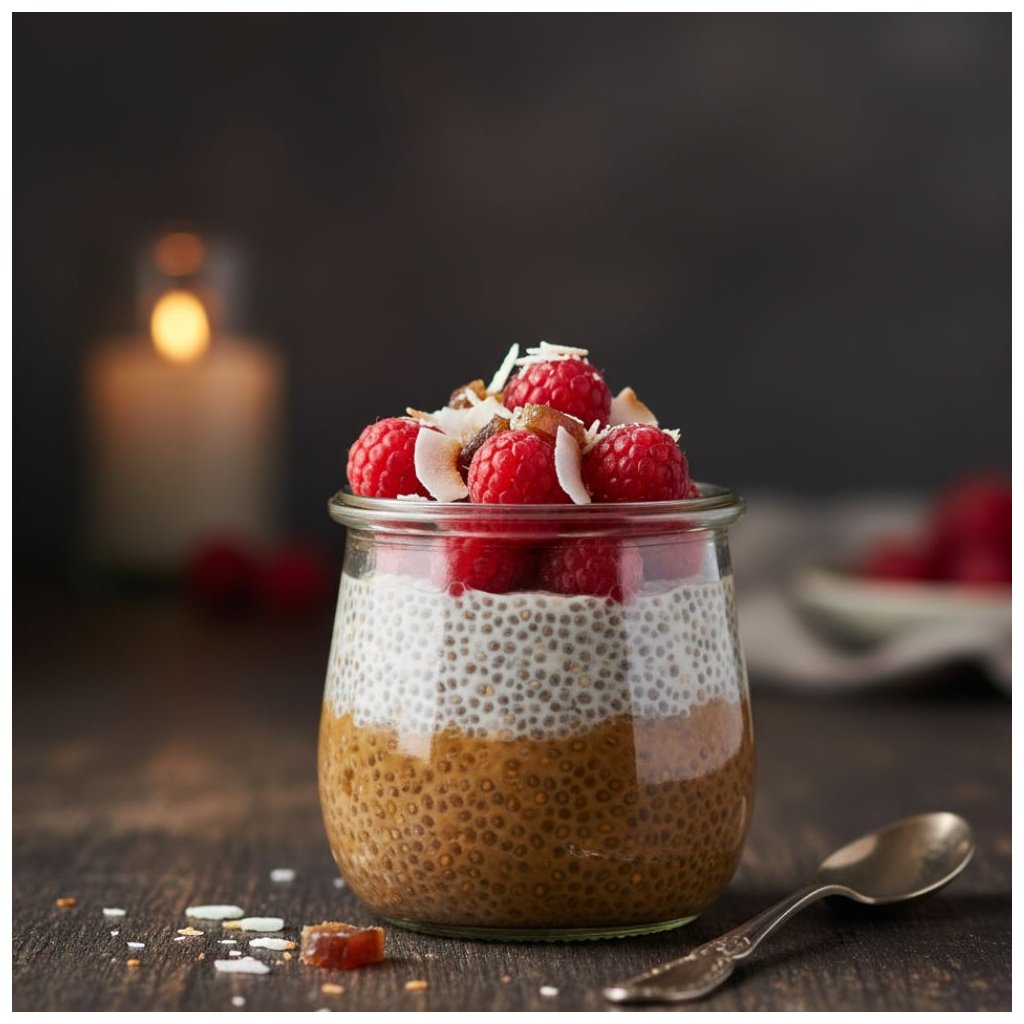 🥣 Recept – Datľový chia puding s kokosom a malinami
