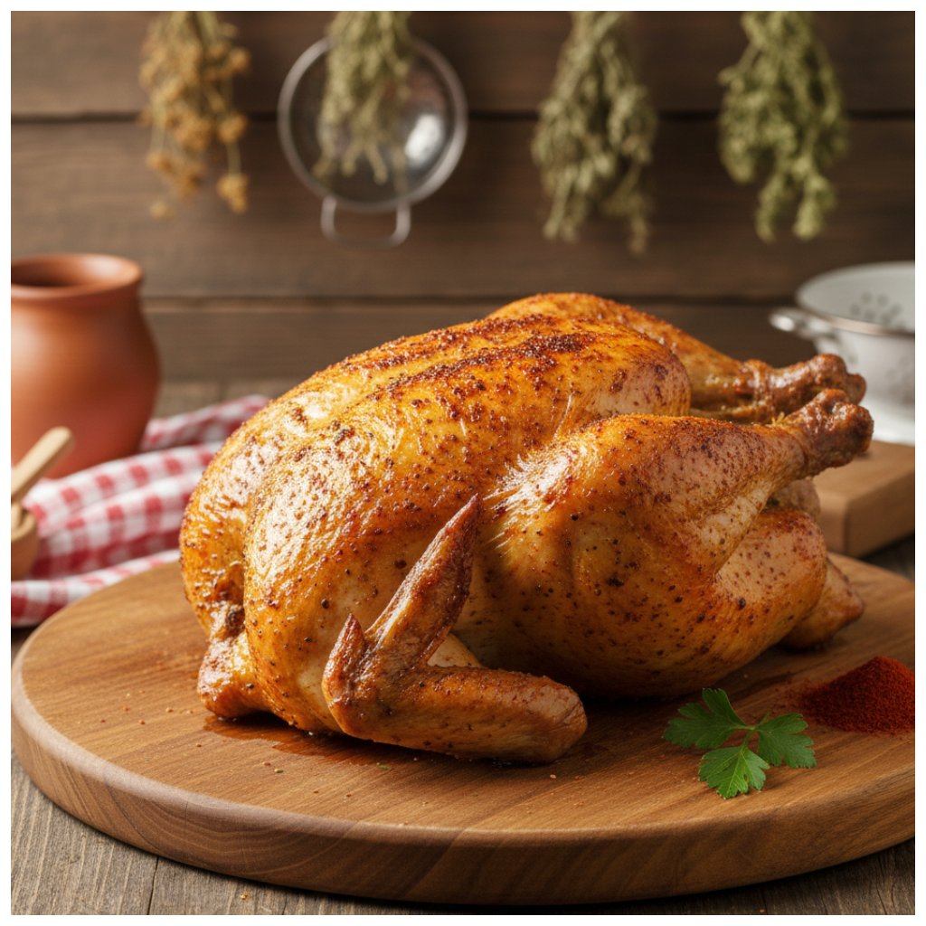 - ➡️ Chrumkavá kôrka na kurati: Celé kura potrite maslom a bohato zasypte korením, aby ste počas pečenia docielili neodolateľne chrumkavý a farebný povrch.