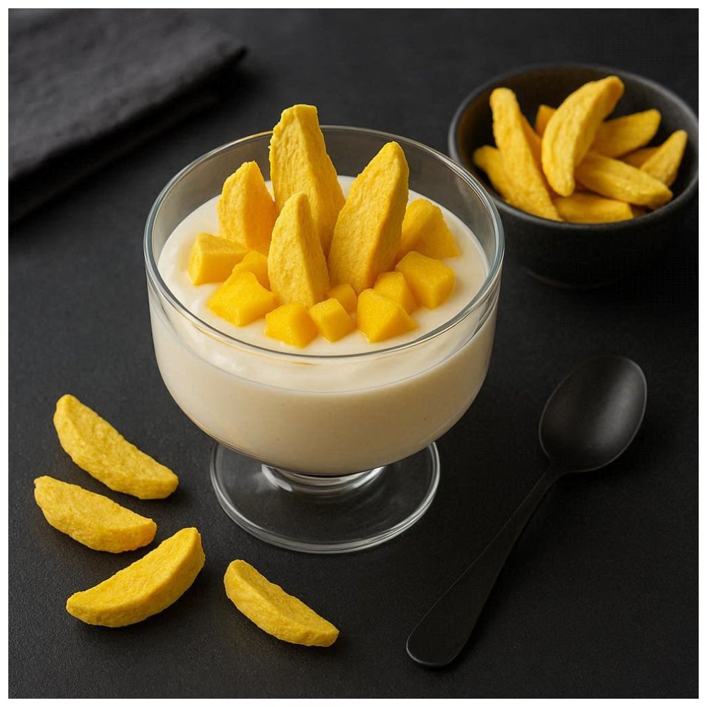 Mango sa najprv hlboko zmrazí a následne sa z neho odstráni voda sublimáciou. Výsledkom je chrumkavé ovocie s plnou chuťou, krásnou farbou a zachovanými živinami – bez pridaných látok.