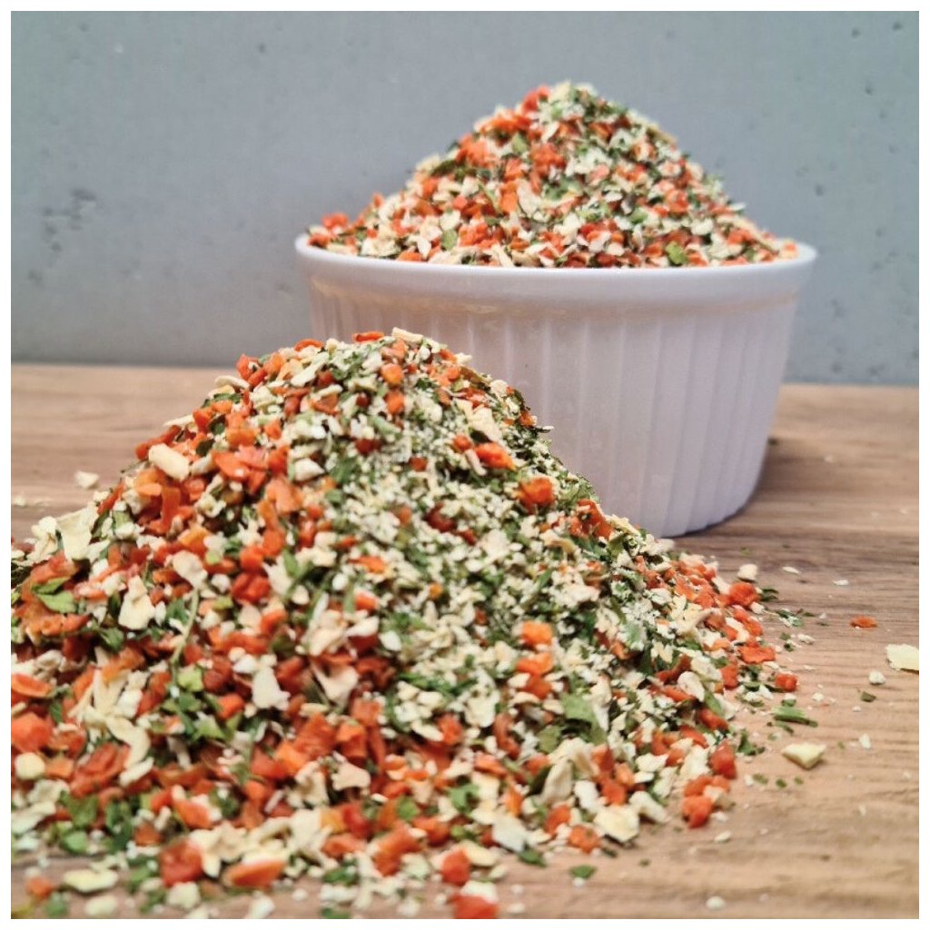 Čerstvá zelenina sa najprv dôkladne očistí a nakrája na rovnomerné kúsky. Potom prechádza pomalým sušením pri nízkych teplotách, aby si zachovala chuť, farbu a výživové látky. Medvedí cesnak sa suší osobitne, aby jeho jemná vôňa nevyprchala. Po usušení sa všetky suroviny ručne miešajú do harmonickej zmesi. Nepoužívajú sa žiadne konzervanty, dochucovadlá ani soľ. Každý krok prebieha s dôrazom na kvalitu a prirodzenosť. Výsledkom je čistá vegeta, ktorá rešpektuje zdravie aj chuťové bunky. Zmes sa balí do ekologických obalov, ktoré chránia arómu.